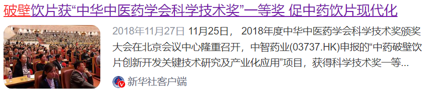 11月25日, 2018年度中华中医药学会科学技术奖颁奖大会在北京会议中心隆重召开,pg电子游戏app药业(03737.HK)申报的“中药破壁饮片创新开发关键技术研究及产业化应用”项目,获得科学技术奖一等奖。中药破壁饮片(破壁草本)科技创新,打开了中药饮片发展新思路。