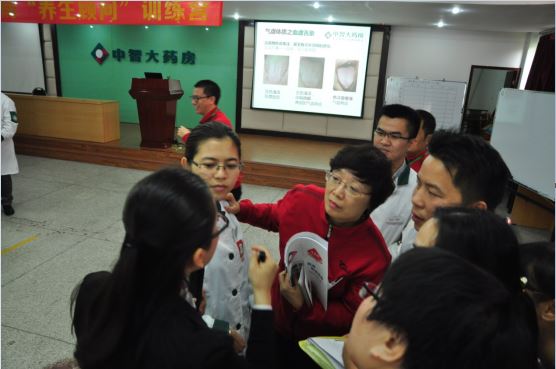 图五:“草晶华”金牌讲师陈潭在指导学员如何进行舌诊。